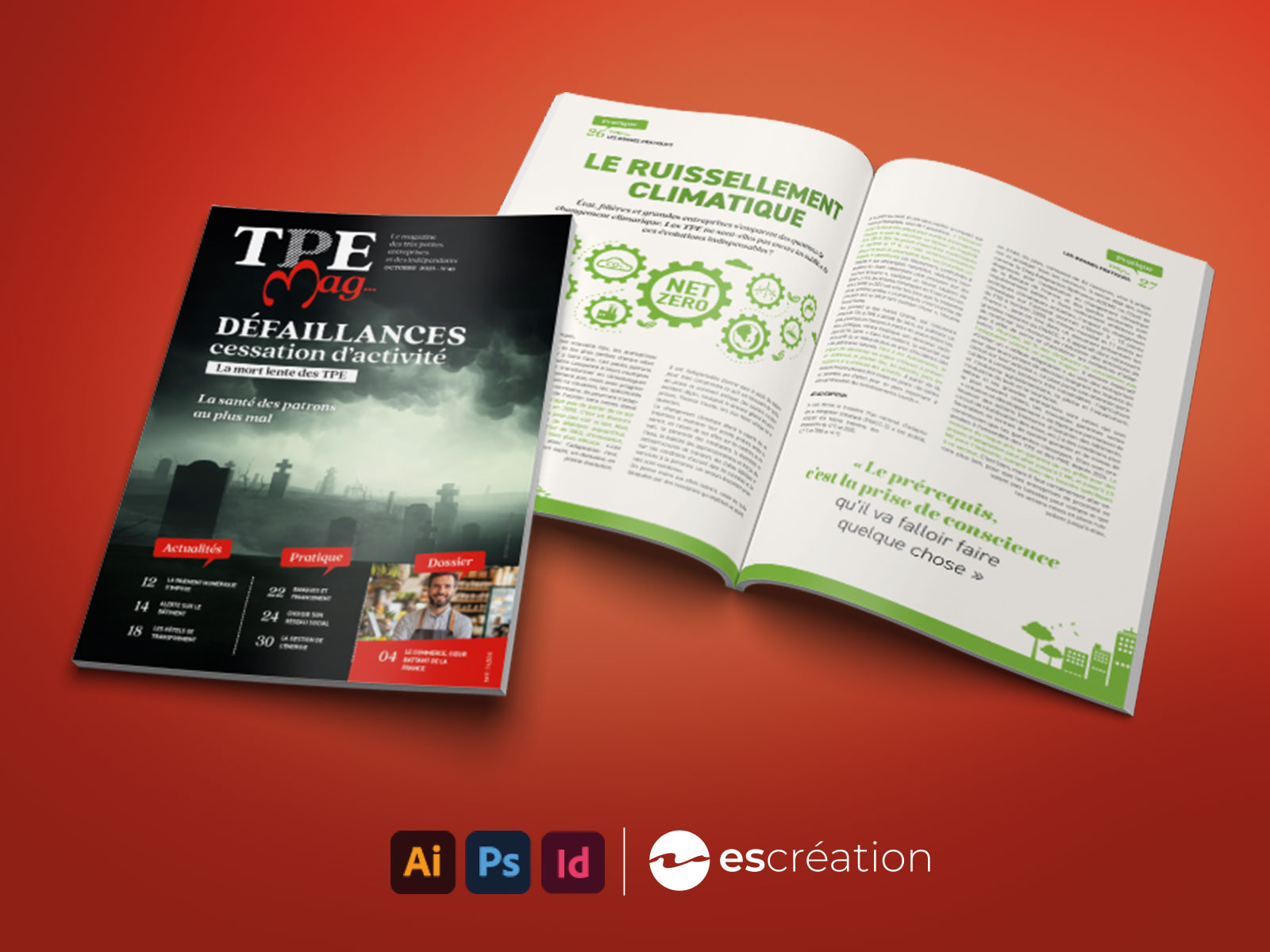 Dans le TPE Mag Octobre 2025 46ème édition, l’enjeu graphique était de taille : traiter des sujets de fond comme les défaillances d’entreprises et le ruissellement climatique, tout en conservant une mise en page aérée et dynamique.